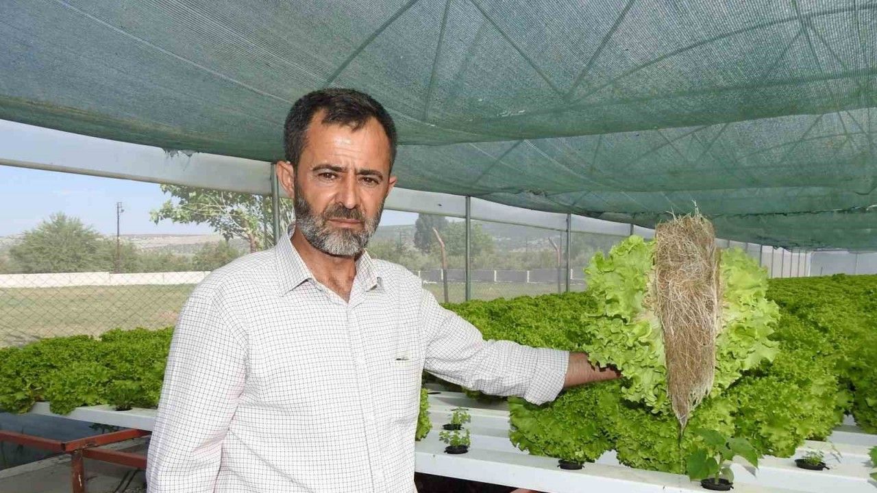 Gaziantep’in Yavuzeli ilçesinde yaklaşık bir dönüm alanda topraksız tarımla yüksek verim elde eden çiftçi Halil Kaya, topraklı tarımla 70 günde yetişen marulu topraksız sulu tarımla 30 günde üretiyor.