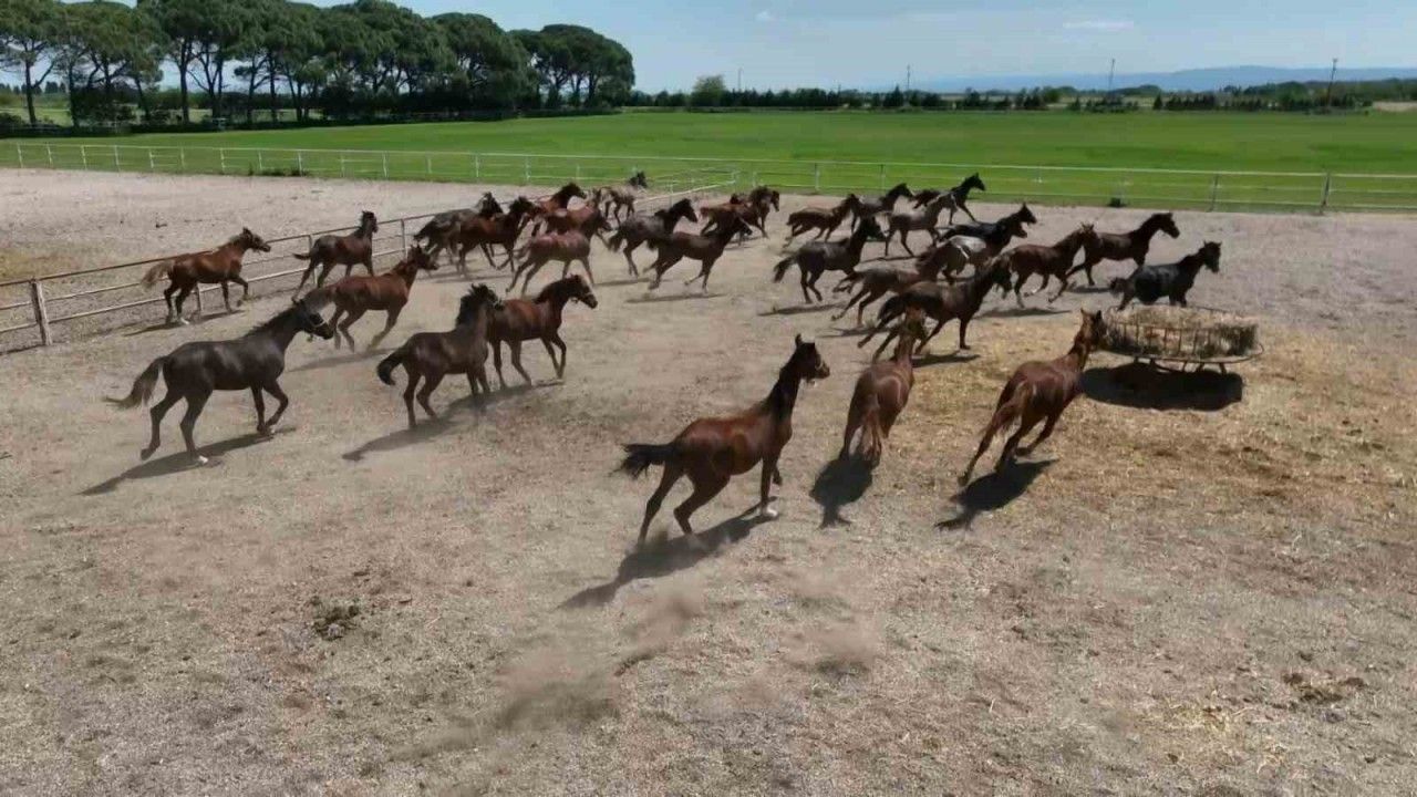 Bugün pistlerde koşan Arap atlarının yarısından fazlasını yetiştiren işletmede büyük bir titizlikle yetiştirilen Türk Arap atları drone ile görüntülendi. Her gün belli saatlerde açık alana salınan atların enerjilerini atmaları, koşuşturmaları ve birbirleriyle oynaşmaları görüntülere yansıdı.