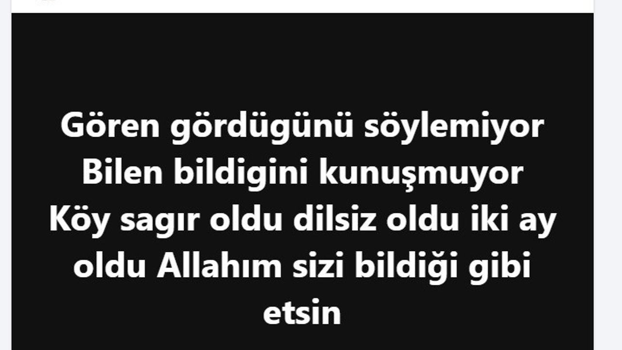 Sosyal medya hesabından paylaşımda bulunan baba Ali Azgın," Gören gördüğünü söylemiyor, bilen bildiğini konuşmuyor köy sağır, dilsiz oldu. İki ay oldu. Allah’ım sizi bildiği gibi etsin" diyerek tepkisini dile getirdi.