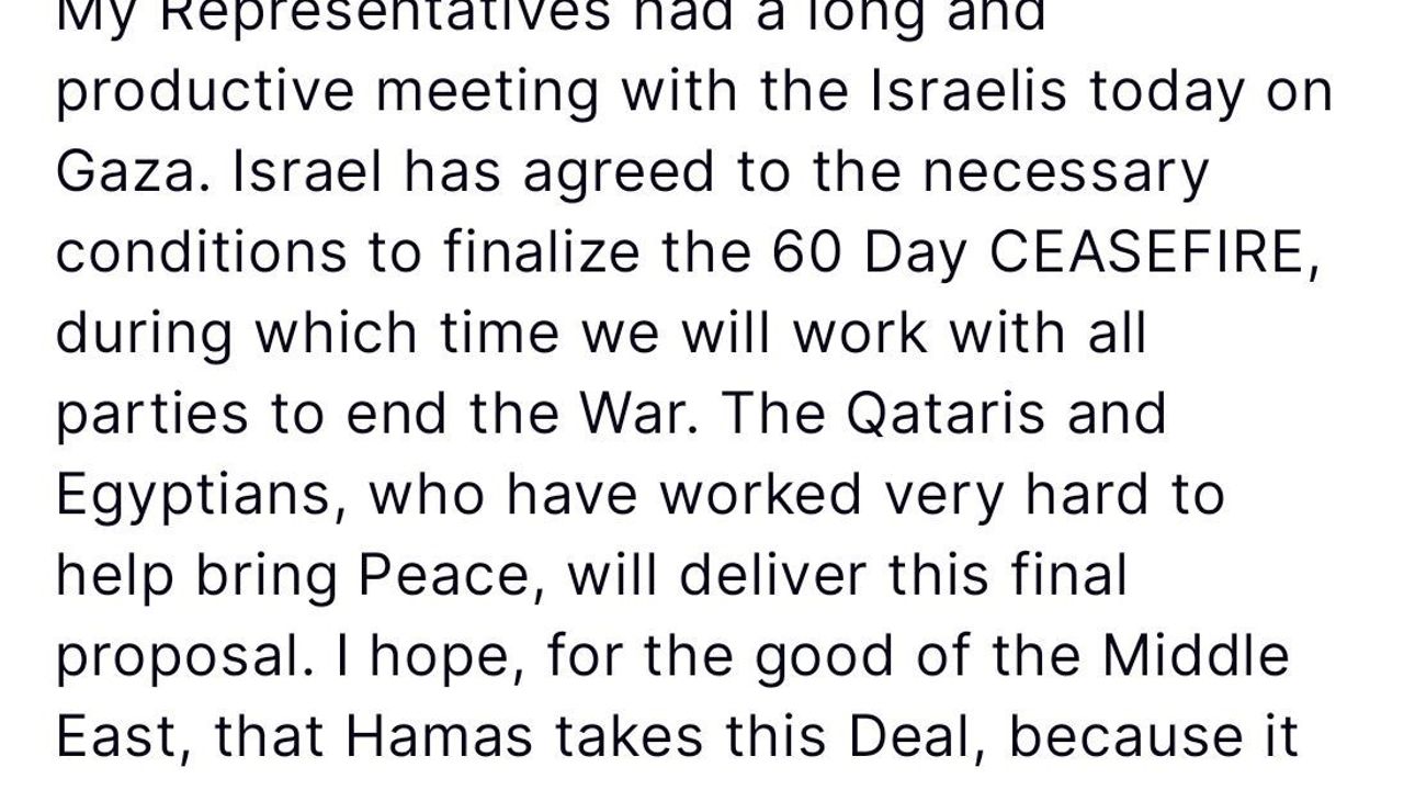 ABD Başkanı Donald Trump, Gazze’de olası ateşkes konusunda İsrail ile temasta bulunduklarını belirterek, "İsrail, 60 günlük ateşkesi kesinleştirmek için gerekli koşulları kabul etti" açıklamasında bulundu.