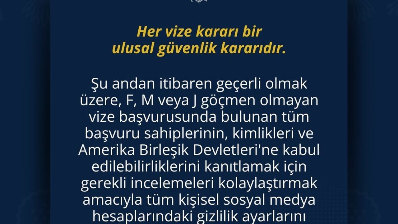 "Şu andan itibaren geçerli olmak üzere, F, M veya J göçmen olmayan vize başvurusunda bulunan tüm başvuru sahiplerinin, kimlikleri ve Amerika Birleşik Devletleri’ne kabul edilebilirliklerini kanıtlamak için gerekli incelemeleri kolaylaştırmak amacıyla tüm kişisel sosyal medya hesaplarındaki gizlilik ayarlarını ‘herkese açık’ olarak ayarlamaları istenecektir."