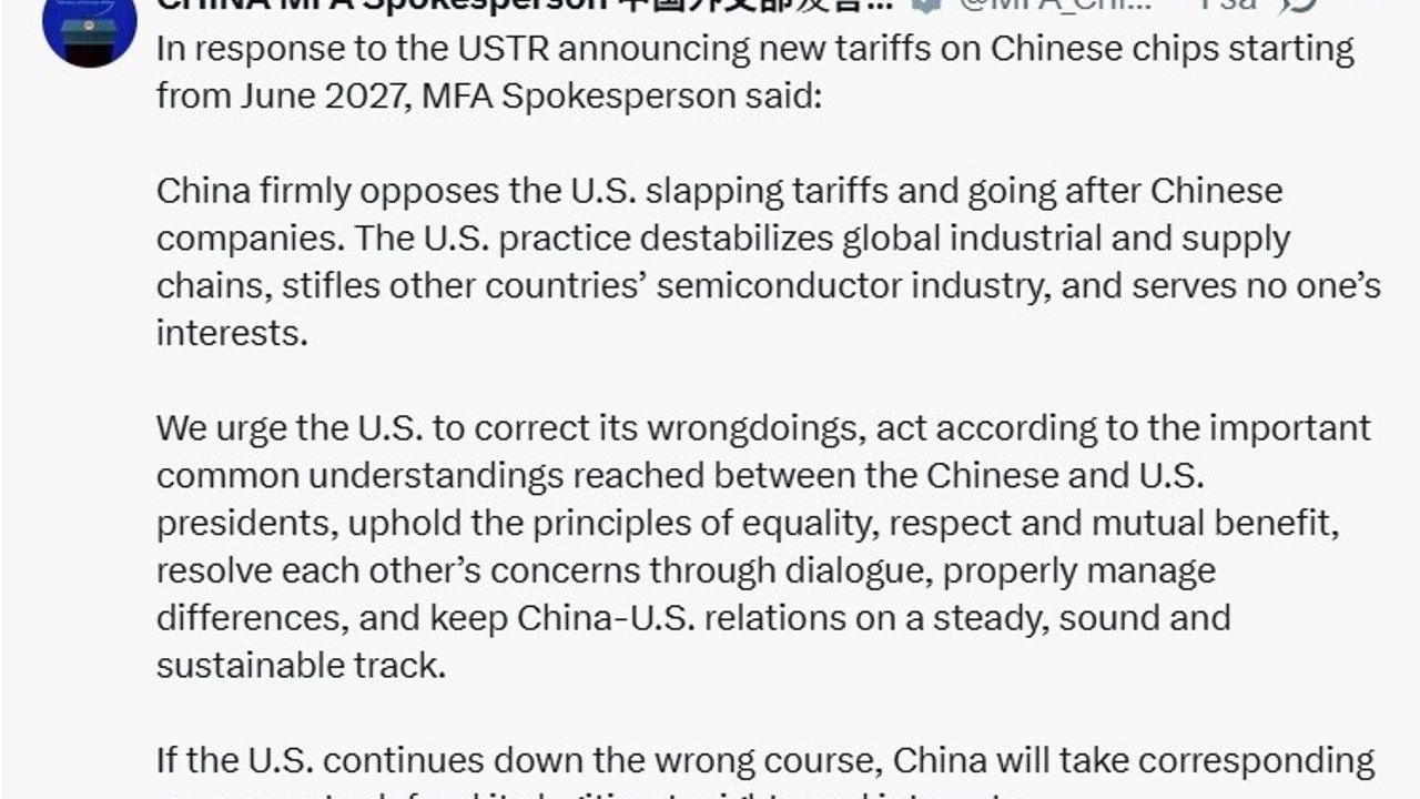 ABD Ticaret Temsilciliği (USTR), Çin'den ithal edilecek yarı iletkenlere 23 Haziran 2027'den itibaren gümrük vergisi uygulanacağı bildirirken, Çin Dışişleri Bakanlığı ise ABD'yi bu karardan dönmeye çağırarak, 'ABD yanlış yolda ilerlemeye devam ederse, Çin meşru hak ve çıkarlarını savunmak için gerekli önlemleri alacaktır' açıklamasında bulundu.