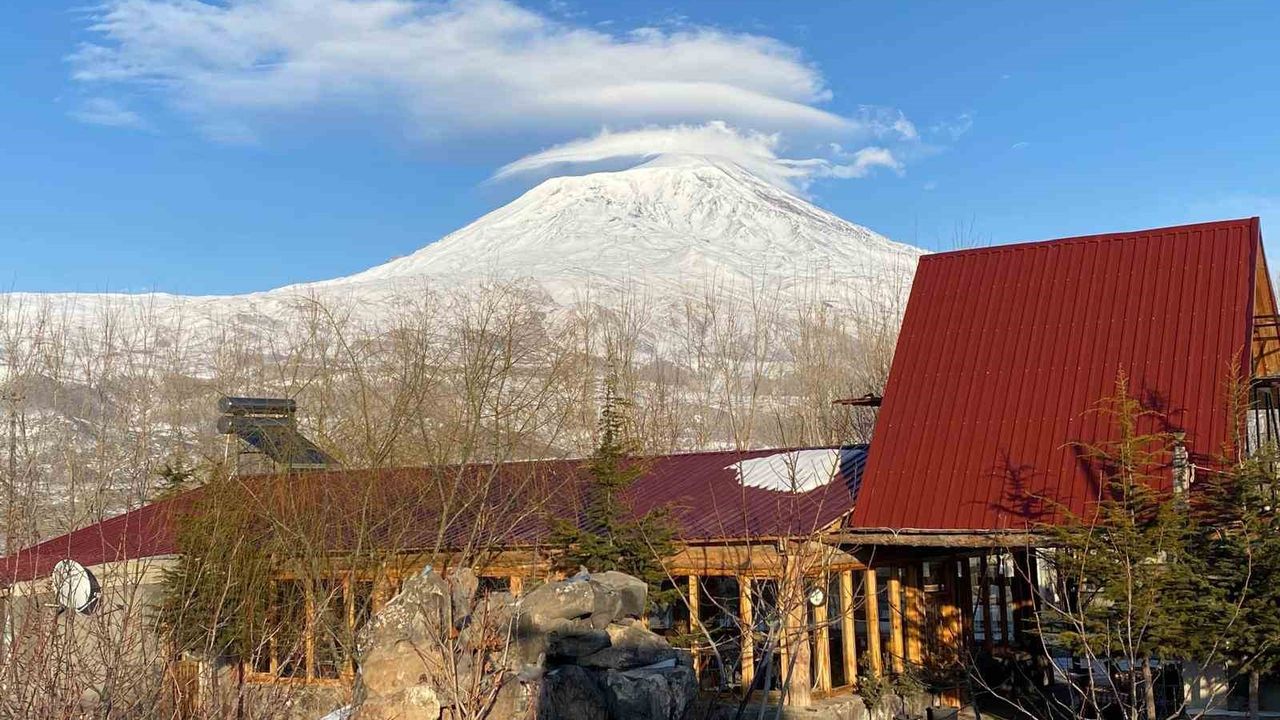 Türkiye'nin en yüksek noktası olan 5 bin 137 metre rakımlı Ağrı Dağı'nın zirvesinde oluşan mercek bulutu, kartpostallık görüntüler oluşturdu. Halk arasında 'şapka' olarak adlandırılan bu nadir doğa olayı, karla kaplı zirveyi tamamen sararak izleyenlerde hayranlık uyandırdı.