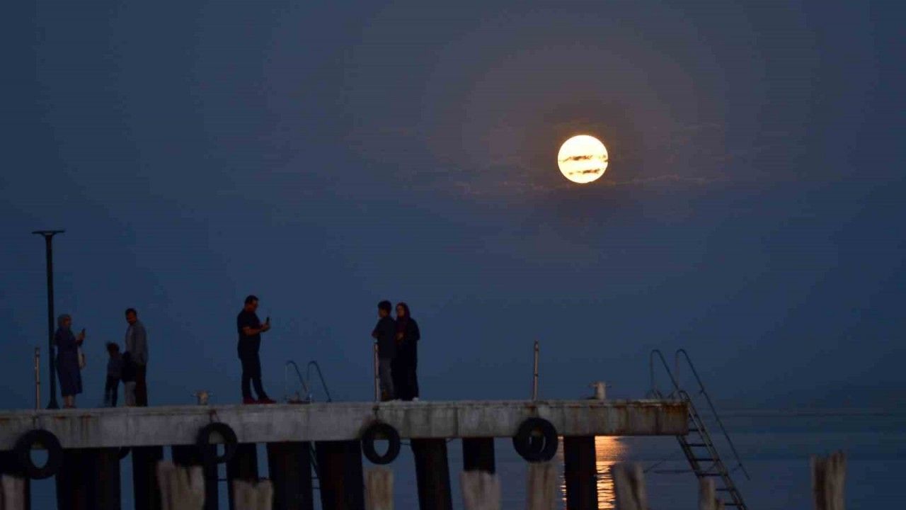 Bitlis’in Ahlat ilçesinde akşam saatlerinde iskele üzerinde beliren dolunay, Van Gölü üzerinde oluşturduğu yakamozla izleyenlere adeta görsel bir şölen yaşattı. Gökyüzünde tüm ihtişamıyla yükselen dolunay, göl yüzeyine yansıyarak eşsiz bir manzara oluşturdu.