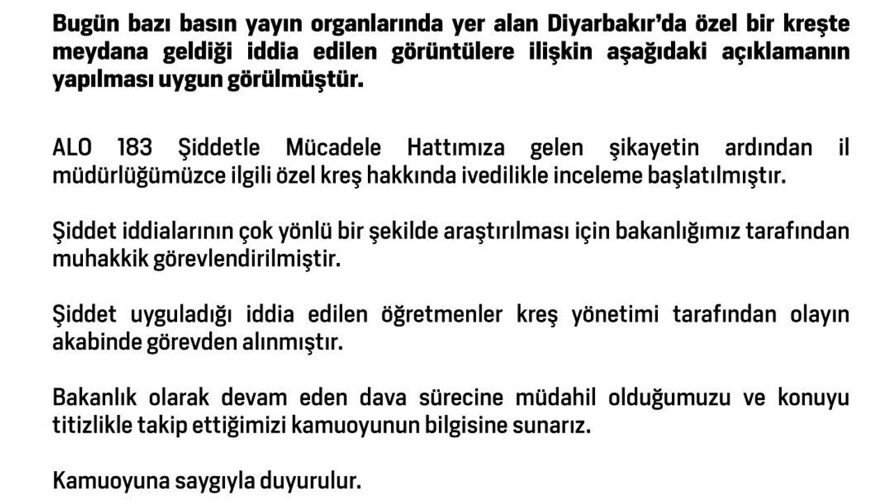 "ALO 183 Şiddetle Mücadele Hattımıza gelen şikayetin ardından il müdürlüğümüzce ilgili özel kreş hakkında ivedilikle inceleme başlatılmıştır. Şiddet iddialarının çok yönlü bir şekilde araştırılması için bakanlığımız tarafından muhakkik görevlendirilmiştir. Şiddet uyguladığı iddia edilen öğretmenler kreş yönetimi tarafından olayın akabinde görevden alınmıştır. Bakanlık olarak devam eden dava sürecine müdahil olduğumuzu ve konuyu titizlikle takip ettiğimizi kamuoyunun bilgisine sunarız."