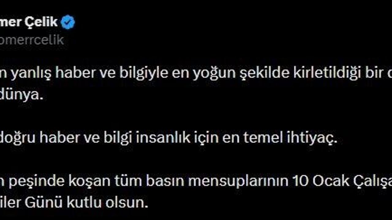 AK Parti Sözcüsü Ömer Çelik, sosyal medya hesabından yaptığı paylaşımda, gerçeğin peşinde koşan tüm basın mensuplarının 10 Ocak Çalışan Gazeteciler Günü'nü kutlayarak şu ifadelere yer verdi: