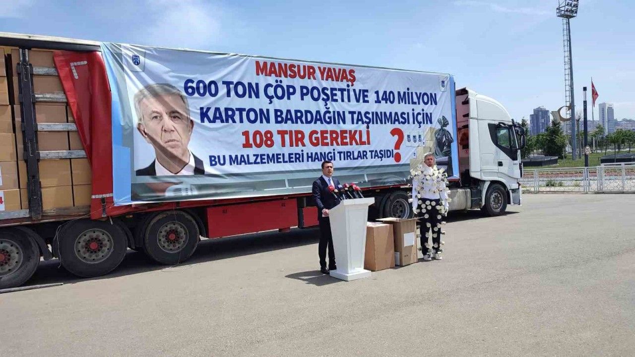 Gökçek, Mansur Yavaş’ın bu malzemelerin 5 tır ile taşındığını söylediğini fakat bu durumun fiziken mümkün olmadığını söyledi. Söz konusu 5 tırın sadece 3 bin malzeme aldığını kanıtladıklarını belirten Gökçek, "Mansur Bey bu malzemelerin 5 tır ile taşındığını söylemişti. Bunun fiziken mümkün olmayacağını ispat etmek istiyorum. Toplamda 140 milyon tane bardak 47 bin adet koliye eşittir. Bu 47 bin tane koliyi 5 tırla taşıdıklarını söylüyorlar. Arkada görmüş olduğunuz tır 4 kapaktan oluşmaktadır. Her bir kapağı 150 adet koli almaktadır. Yani toplamda 600 adet koliyi alabilecek kapasitededir. Ankara Büyükşehir Belediyesi 140 milyon tane bardağı 5 tıra sığdırdığını söylüyor. Fiziken bu imkansızdır. Eğer 108 tır malzemeyi 5 tırla taşıdıklarını söylüyorlar ise buradaki soygun çok açık ve net bir şekilde ortadadır. Çünkü 5 tırın içerisine girebilecek sayı 3 bin adettir. Buradaki 47 bin sayısı nerededir, 3 bin sayısı nerededir? Bunu buraya sığdırabilmeniz mümkün değildir" değerlendirmelerinde bulundu.