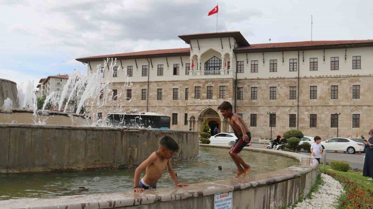 Sivas’ta Tarihi Kent meydanında, Valilik binasının önündeki süs havuzuna giren çocuklar, akan trafiğe ve havuzdaki elektrik donanımına aldırış etmeden serinlemeye çalıştı.