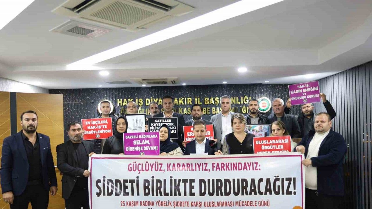 HAK-İŞ Konfederasyonu Diyarbakır İl Başkanı ve Öz Sağlık İş Sendikası Şube Başkanı Mehmet Aküzüm, 25 Kasım Kadına Yönelik Şiddete Karşı Uluslararası Mücadele Günü vesilesiyle HAK-İŞ Konfederasyonu olarak 81 ilde meydanlarda olduklarını söyledi. Kadınlar ve çocuklar başta olmak üzere dünyanın dört bir yanında zulme, işgale, ayrımcılığa ve her türden şiddete maruz bırakılan masumların sesi olmak için kadın-erkek hep birlikte alanlarda olduklarını belirten Aküzüm, "Nereden ve kimden gelirse gelsin şiddetin tüm biçimlerine karşı olduğumuzu yüksek bir sesle ilan ediyoruz. Günümüzde şiddet fiziksel, cinsel, psikolojik, dijital, ekonomik ve ısrarlı takip gibi farklı boyutlarıyla hayatın her alanında karşımıza çıkmaktadır. Araştırmalar, şiddetin en fazla kadınları hedef aldığını açıkça göstermektedir" diye konuştu.