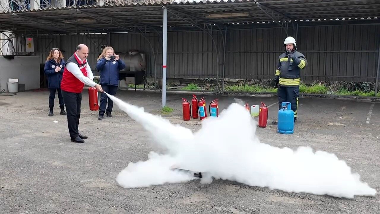 Uzman itfaiye ekipleri tarafından verilen eğitimde, olası yangın durumlarında panik yapılmadan doğru müdahalenin nasıl yapılacağı, yangının büyümeden kontrol altına alınabilmesi için uygulanması gereken temel kurallar ve yangın söndürme cihazlarının etkin kullanımı anlatıldı.