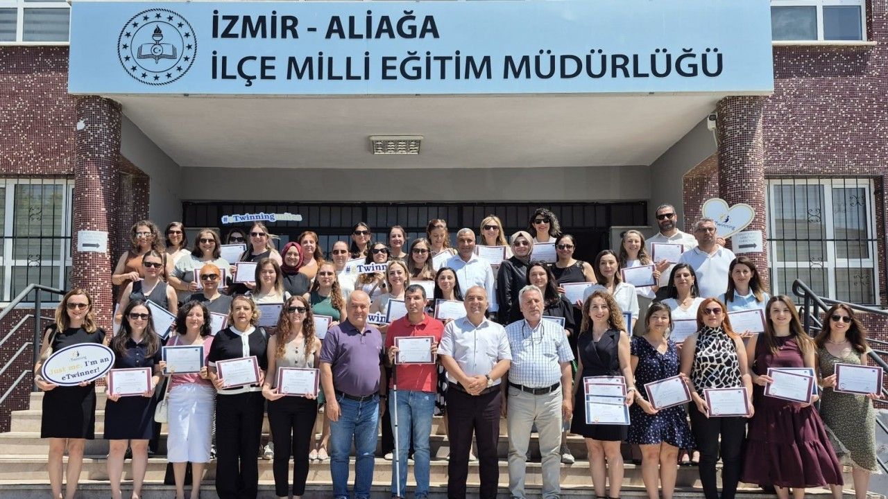 İzmir İl Milli Eğitim Müdürlüğü koordinesinde tüm ilçelerle eş zamanlı olarak düzenlenen eTwinning Kalite Etiketi töreni, Aliağa İlçe Milli Eğitim Müdürlüğü Konferans Salonu’nda gerçekleştirildi. Törende, Aliağa’daki 26 okuldan 57 öğretmene, yürüttükleri başarılı projeler dolayısıyla toplam 126 adet Ulusal ve Uluslararası Kalite Etiketi takdim edildi. Sertifikalar, İlçe Milli Eğitim Müdürü Dr. Erdoğan Akyüz, Şube Müdürleri Ahmet Kılıç, Ali Civcir ve Murat Abalı tarafından öğretmenlere verildi.
