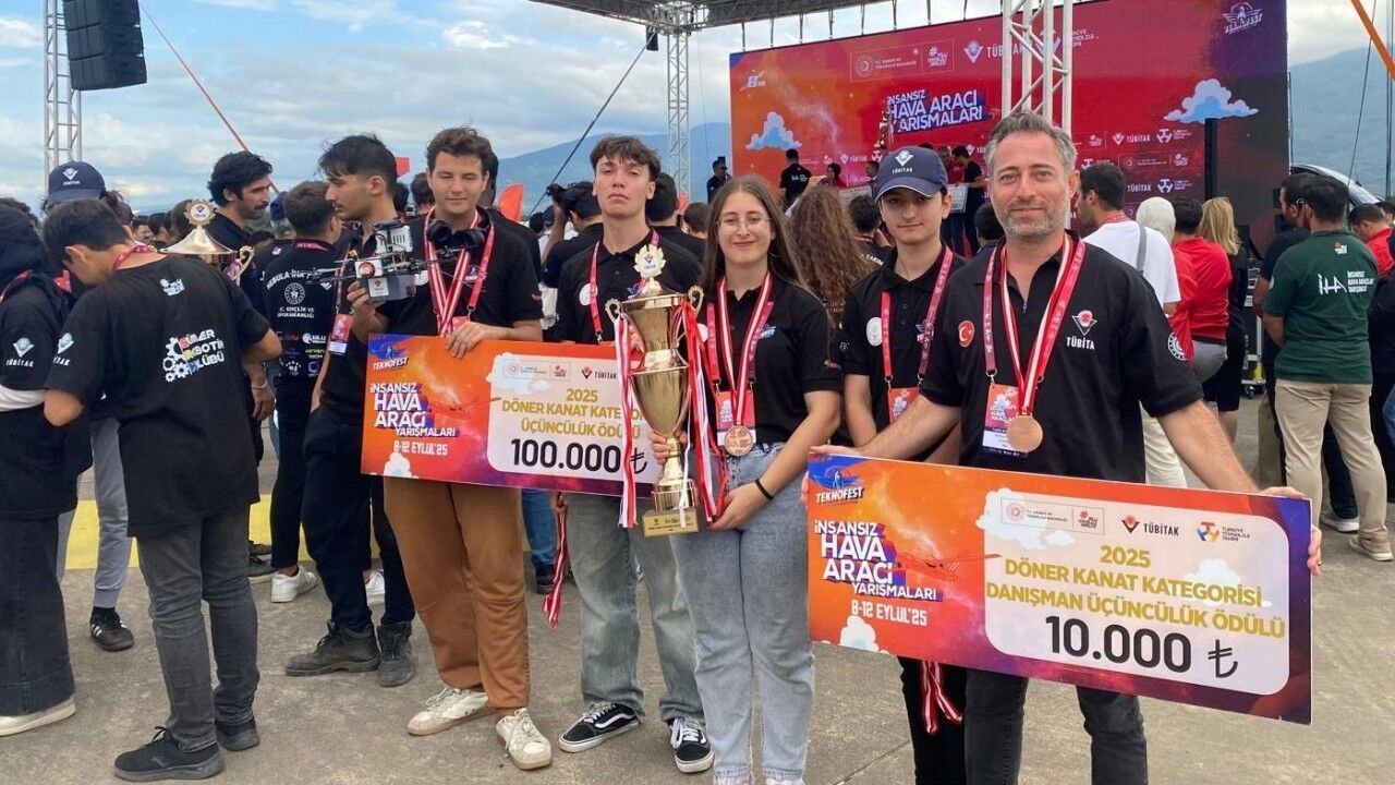 Danışman öğretmen Ferhat Demir’in öğrencileri Ömer Erdem Sezer, Murat Eymen Altuntaş, Gülden Tunç ve Göktürk Umut Başpınar’dan oluşan takım, 2bin589 yarışmacının başvuru yaptığı yarışmada 59 finalist arasında insansız hava aracı döner kanat kategorisinde Türkiye üçüncülüğü elde etti.