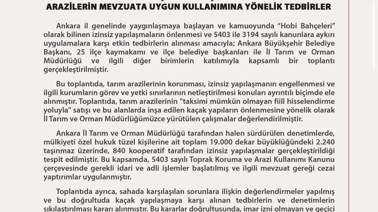 "Ankara Büyükşehir Belediye Başkanı, 25 ilçe kaymakamı ve ilçe belediye başkanları ile İl Tarım ve Orman Müdürlüğü ve ilgili diğer birimlerin katılımıyla kapsamlı bir toplantı gerçekleştirilmiştir. Bu toplantıda, tarım arazilerinin korunması, izinsiz yapılaşmanın engellenmesi ve ilgili kurumların görev ve yetki sınırlarının netleştirilmesi konuları ayrıntılı biçimde ele alınmıştır. Toplantıda, tarım arazilerinin ‘taksimi mümkün olmayan fiilî hisselendirme yoluyla’ satışı ve bu alanlarda inşa edilen kaçak yapıların önlenmesine yönelik olarak İl Tarım ve Orman Müdürlüğümüzce yürütülen çalışmalar değerlendirilmiştir. Ankara İl Tarım ve Orman Müdürlüğü tarafından halen sürdürülen denetimlerde, mülkiyeti özel hukuk tüzel kişilerine ait toplam 19 bin dekar büyüklüğündeki 2 bin 240 taşınmaz üzerinde, 840 kooperatif tarafından izinsiz yapılaşmalar gerçekleştirildiği tespit edilmiştir. Bu kapsamda, 5403 sayılı Toprak Koruma ve Arazi Kullanımı Kanunu çerçevesinde gerekli idari ve adli işlemler başlatılmış ve ilgili mevzuat gereği cezai yaptırımlar uygulanmıştır."