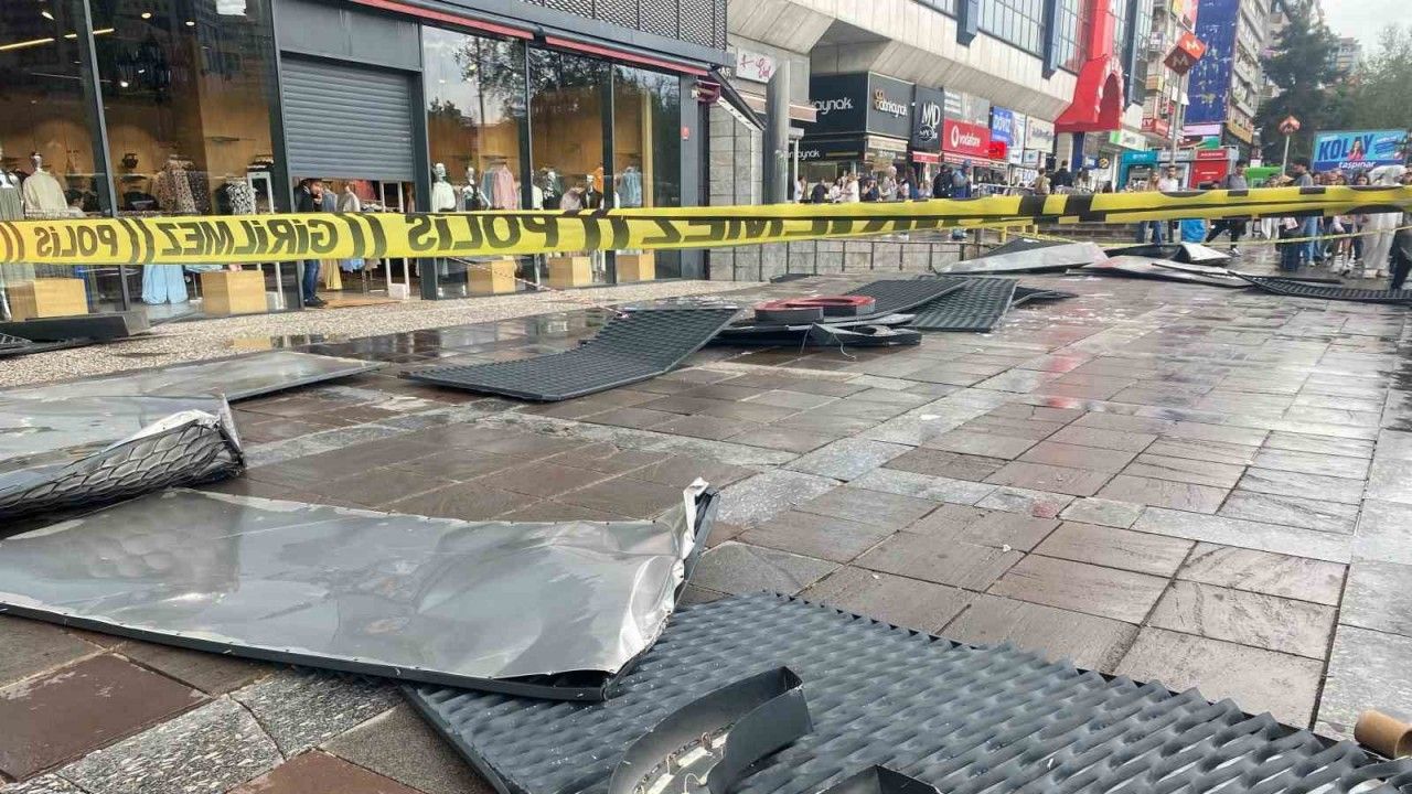 Ankara’da etkili olan fırtına Kızılay’da bulunan bir mağazanın tabelasını caddeye savurdu.
