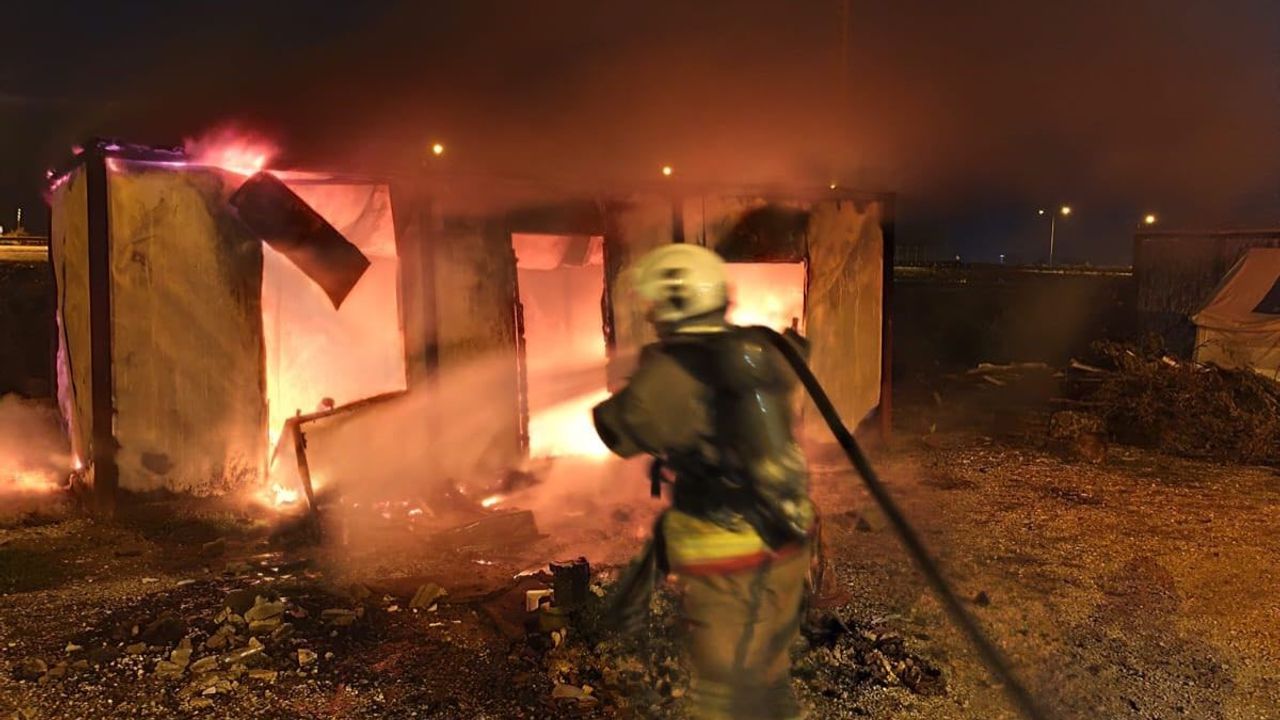 Hatay'da alevlere teslim olan konteyner yanarak kullanılmaz hale geldi.