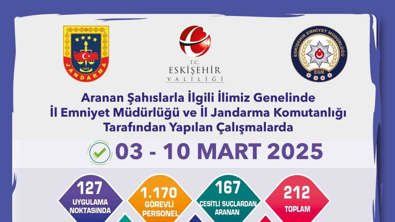 Edinilen bilgilere göre, İl Emniyet Müdürlüğü ve İl Jandarma Komutanlığı ekiplerince aranan şahıslarla ilgili çalışma yapıldı. Bu çerçevede, kent genelinde 3-10 Mart 2025 tarihlerinde 127 uygulama noktasında bin 170 personel görevlendirildi. Ekiplerce yürütülen çalışmalar sonucunda; 5 yıla kadar aranan 38 şahıs, 5 ile 10 yıla kadar aranan 5 şahıs, 10 yıl ve üzeri aranan 2 şahıs ile çeşitli suçlardan aranan 167 şahıs olmak üzere toplam 212 şahsın yakalandığı belirtildi.