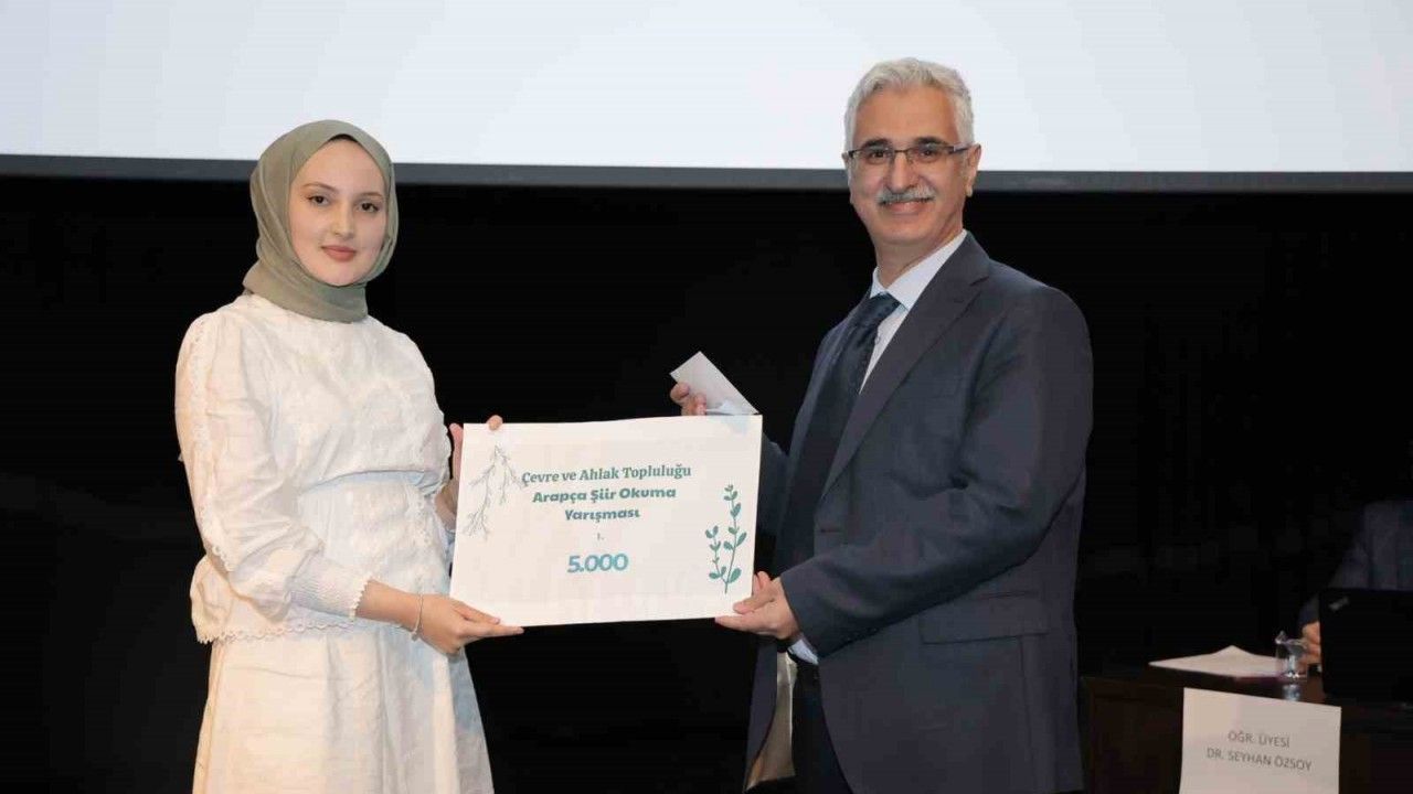Düzce Üniversitesi İlahiyat Fakültesi ile Çevre ve Ahlak Topluluğu iş birliğiyle düzenlenen Arapça Şiir Okuma Yarışması’nda birinci olan Havvanur Çalışkan’a 5 bin TL ödül verildi.