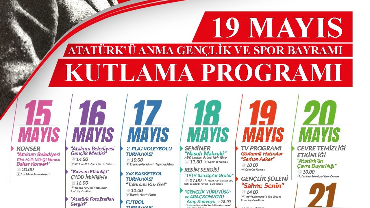 Kutlama programı, 21 Mayıs Çarşamba günü saat 20.00’de Ata Sahne’de Atakum Belediyesi Türk Sanat Müziği Korosunun gerçekleştireceği "Atatürk’ü Anma, Gençlik ve Spor Bayramı Konseri" ile sona erecek.