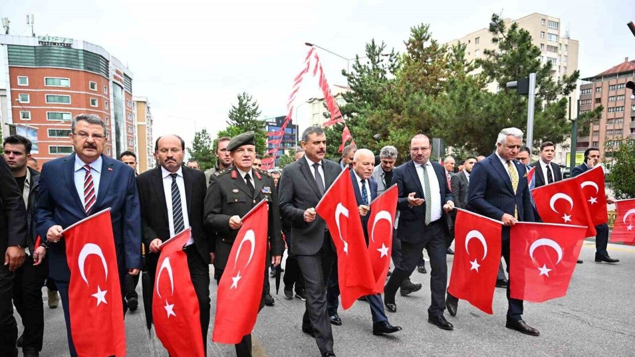 İstanbulkapı mevkiinde bir araya gelen öğrenciler, gaziler, vatandaşlar ve atlı cirit ekibi, Kolordu Komutanlığı Bölge Bandosu eşliğinde ellerinde Türk bayrakları ve Atatürk posterleriyle Havuzbaşı Kent Meydanı’na kadar yürüdü.