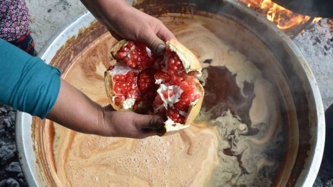 Aydın’ın Efeler ilçesi Dağeymiri Mahallesi’nde nar ekşisi üretimi, dededen kalma yöntemlerle sürdürülüyor. Vatandaşlardan Muharrem Ay ve ailesi, topladıkları narları tahta teknede ezip odun ateşinde kaynatarak geleneksel lezzeti yaşatıyor.