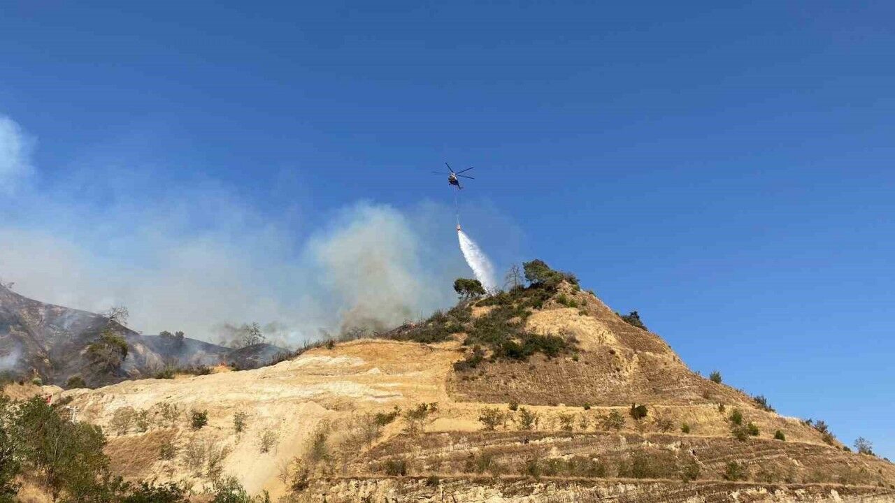 Aydın’ın Efeler ilçesinde dağlık alanda çıkan yangını söndürme çalışmaları havadan ve karadan devam ediyor.