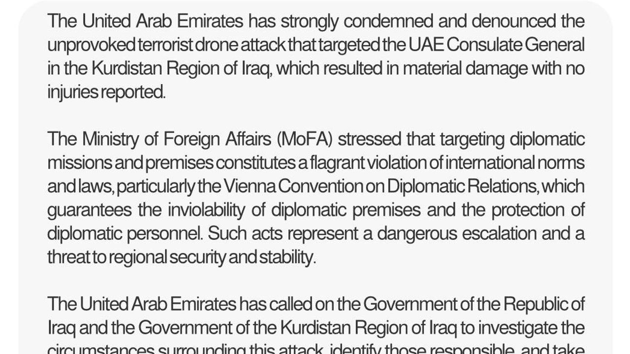 Birleşik Arap Emirlikleri (BAE) Dışişleri Bakanlığı, Kürt Bölgesel Yönetimi'ndeki BAE Başkonsolosluğu'na insansız hava aracı (İHA) saldırısı düzenlendiğini duyurarak, 'Herhangi bir can kaybına yol açmayan, ancak maddi hasara neden olan bu terörist İHA saldırısını şiddetle kınıyoruz' açıklamasında bulundu.