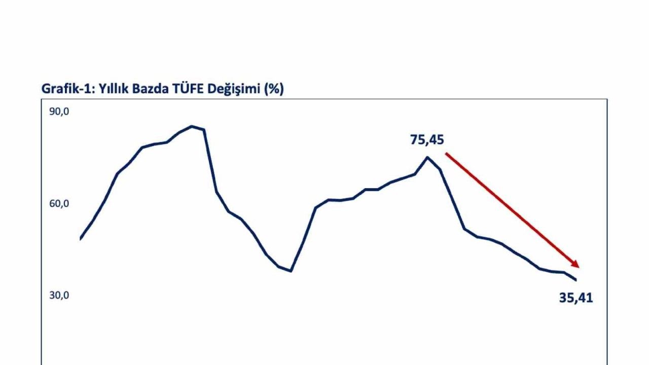 "Bunun sonucunda 2024 Mayıs ayına kıyasla enflasyon son 12 ayda 40,0 puan üzerinde gerilemiştir. Yİ-ÜFE’deki (2003=100) değişim 2025 yılı Mayıs ayında bir önceki aya göre yüzde 2,48 olarak gerçekleşmiş, böylece yıllık enflasyon yüzde 23,13 olarak gerçekleşmiştir. Çekirdek TÜFE C endeksinde (enerji, gıda ve içecekler ile tütün ürünleri ve altın hariç, TÜFE) yıllık enflasyon bir önceki aya göre yüzde 2,43 olarak gerçeklemiş yıllık enflasyon ise yüzde 35,37 olmuştur. Fiyat katılığının yüksek olduğu hizmetler grubunda yıllık enflasyon bir önceki aya göre 3,4 puan gerileyerek yaklaşık son 35 ayın en düşük seviyesi olan yüzde 51,2 olmuştur."
