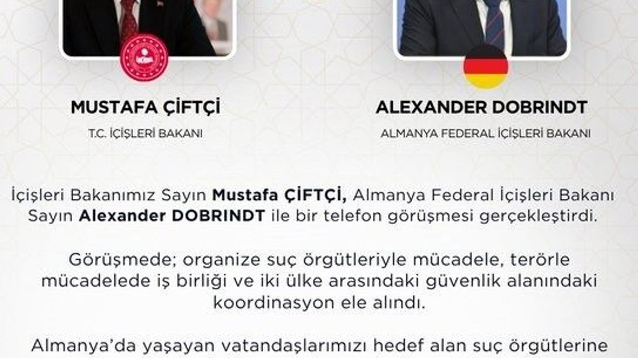 İçişleri Bakanı Mustafa Çiftçi, Almanya Federal İçişleri Bakanı Alexander Dobrindt ile telefon görüşmesi gerçekleştirdi.