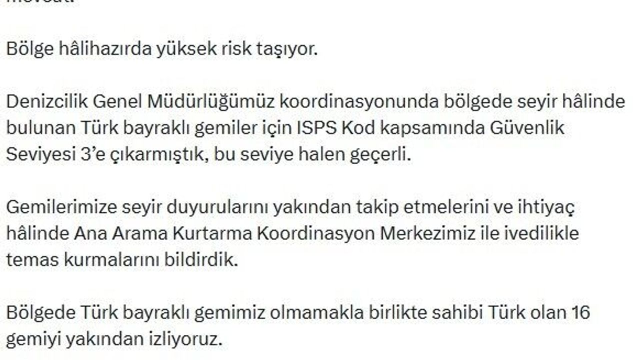'Hürmüz Boğazı'ndaki ve bölgedeki su yollarındaki gelişmeleri anbean takip ediyoruz. Bilindiği üzere Ortadoğu'da yaşanan savaş nedeniyle 28 Şubat'tan itibaren Hürmüz Boğazı'ndan gemi geçişleri durduruldu. Şu anda Basra Körfezi'nde yüzlerce gemi bekliyor, bazı ticari gemilerde ise hasar bilgileri mevcut. Bölge halihazırda yüksek risk taşıyor. Denizcilik Genel Müdürlüğümüz koordinasyonunda bölgede seyir halinde bulunan Türk bayraklı gemiler için ISPS Kod kapsamında Güvenlik Seviyesi 3'e çıkarmıştık, bu seviye halen geçerli. Gemilerimize seyir duyurularını yakından takip etmelerini ve ihtiyaç halinde Ana Arama Kurtarma Koordinasyon Merkezimiz ile ivedilikle temas kurmalarını bildirdik. Bölgede Türk bayraklı gemimiz olmamakla birlikte sahibi Türk olan 16 gemiyi yakından izliyoruz. Tüm bu gelişmeler, uluslararası deniz kurallarının temel ilkelerinden olan seyrüsefer serbestisinin korunmasının hayati önemini bir kez daha ortaya koymaktadır. Denizcilerimizin güvenliği ve ticaret filomuzun korunması için gerekli tüm diplomatik ve idari tedbirleri kararlılıkla almaya devam edeceğiz.'