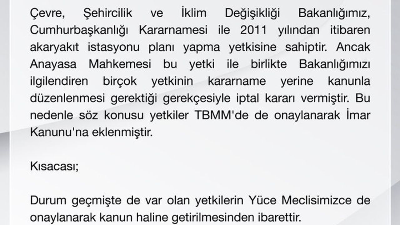 Çevre, Şehircilik ve İklim Değişikliği Bakanlığı, CHP Genel Başkanı Özgür Özel’in grup toplantısında gündeme getirdiği akaryakıt istasyonlarıyla ilgili iddialarına ilişkin açıklama yaptı. Açıklamada, "CHP Genel Başkanı Sayın Özgür Özel’in grup toplantısında gündeme getirdiği akaryakıt istasyonları ile ilgili iddiaları tamamen gerçek dışıdır. Çevre, Şehircilik ve İklim Değişikliği Bakanlığımız, Cumhurbaşkanlığı Kararnamesi ile 2011 yılından itibaren akaryakıt istasyonu planı yapma yetkisine sahiptir. Ancak Anayasa Mahkemesi bu yetki ile birlikte bakanlığımızı ilgilendiren birçok yetkinin kararname yerine kanunla düzenlenmesi gerektiği gerekçesiyle iptal kararı vermiştir. Bu nedenle söz konusu yetkiler TBMM’de de onaylanarak İmar Kanunu’na eklenmiştir. Kısacası; durum geçmişte de var olan yetkilerin Yüce Meclisimizce de onaylanarak kanun haline getirilmesinden ibarettir. Burada yeni bir düzenleme yoktur. Dolayısıyla iddia edildiği gibi kişiye özel bir uygulama söz konusu bile değildir" denildi.