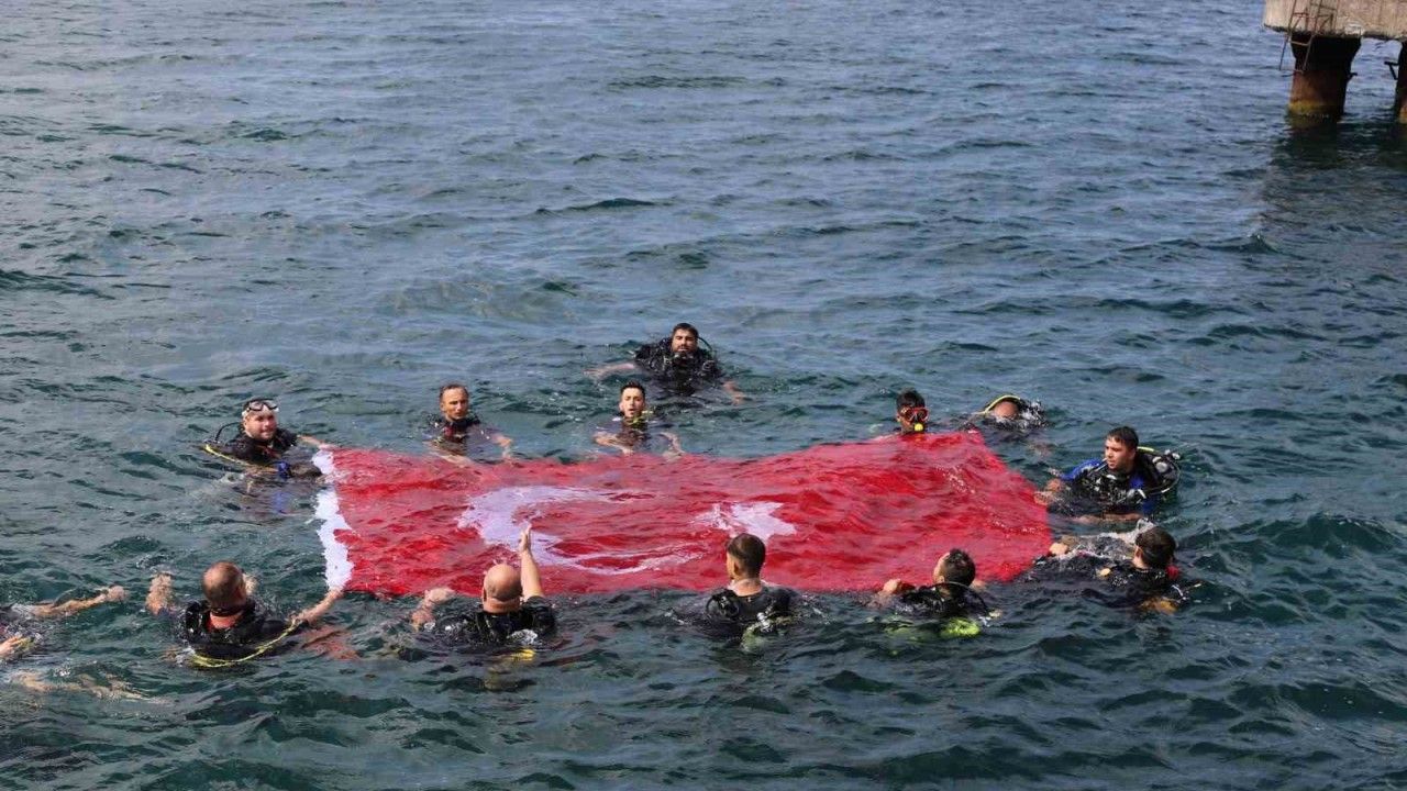 Denizcilik Fakültesi Eğitim ve Uygulama Yerleşkesi Hüseyin Avni Kocaman Deniz Bilim Merkezi’nde düzenlenen etkinlikte, ilk olarak 13 öğrenci ve dalış eğitmenleri suya indi. Ardından engelli bireyler ile Deniz Kuvvetleri Komutanlığı’na bağlı mayın harbi dalgıçları 10 metre derinliğe dalış yaptı. Dalgıçlar, çıkışta Şanlı Türk bayrağını deniz altında açarak Zafer Bayramı coşkusunu suyun altında yaşattı.