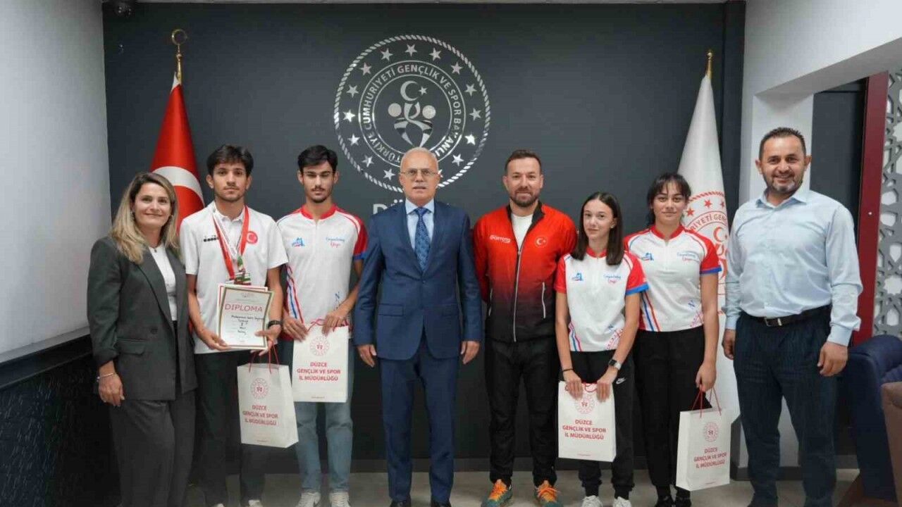 DÜZCE(İHA) –Türkiye’de şampiyonalarında elde ettikleri derecelerle dikkat çeken oryantiring sporcularını Düzce Gençlik ve Spor İl Müdürü Zekeriya Arslantürk ağırladı.
