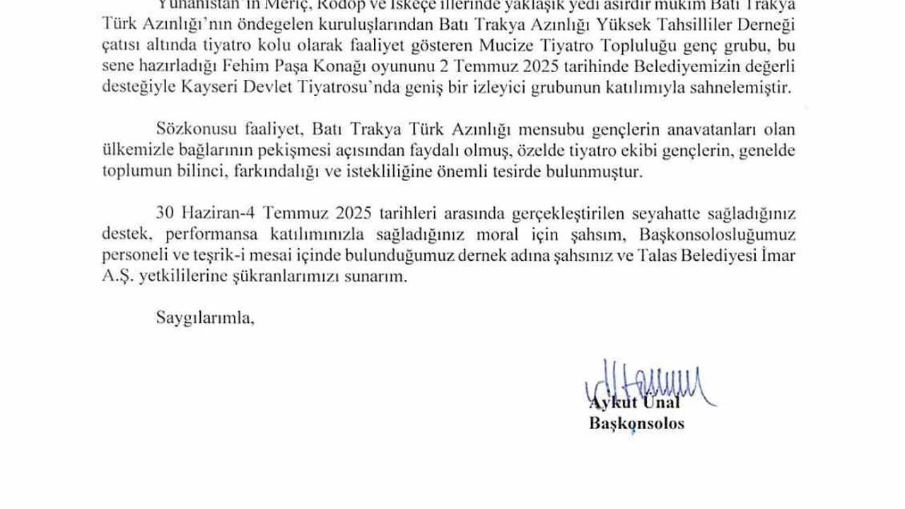 Gümülcine Başkonsolosu Aykut Ünal, 7 Temmuz tarihli mektubunda Batı Trakya Azınlığı Yüksek Tahsilliler Derneği çatısı altındaki tiyatro topluluğunun "Fehim Paşa Konağı" oyununu Kayseri’de sahnelemesinden duyduğu memnuniyeti dile getirdi. Talas Belediyesi’nin destekleriyle gerçekleşen etkinliğin önemine dikkat çeken Ünal, "Söz konusu faaliyet, Batı Trakya Türk Azınlığı mensubu gençlerin anavatanları olan ülkemizle bağlarının pekişmesi açısından faydalı olmuş, toplumun bilinci ve farkındalığına önemli tesirde bulunmuştur" ifadeleriyle organizasyonun manevi değerine vurgu yaptı.