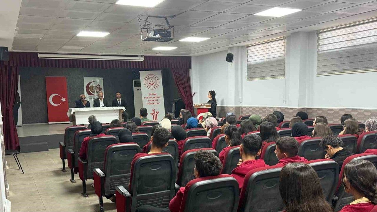 Sason Anadolu Lisesi konferans salonunda düzenlenen programa Sason Sosyal Hizmetler Merkezi Müdürü Hakan Akın, şehit aileleri, gaziler ve öğrenciler katıldı.