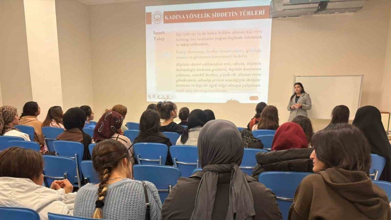 Seminerde öğrencilere, kadına yönelik şiddetin türleri, şiddet döngüsü, şiddet karşısında izlenecek hukuki yollar ve 6284 sayılı ’Ailenin Korunması ve Kadına Karşı Şiddetin Önlenmesine Dair Kanun’ hakkında bilgilendirme yapıldı.