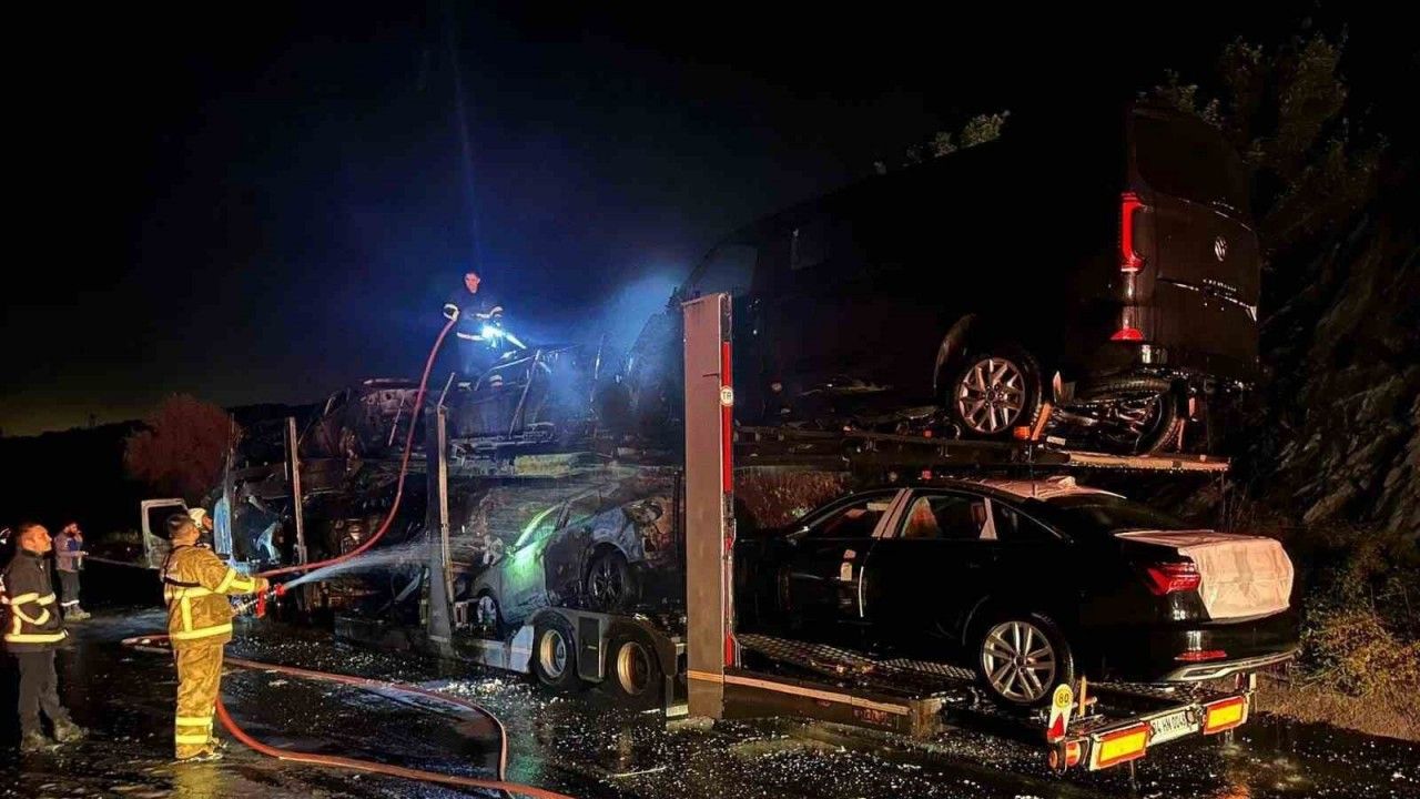 Bilecik’te seyir halinde bir anda motor bölümden alevler yükselen tırın dorsesinde yüklü 8 adet sıfır araç kullanılmaz hale geldi.