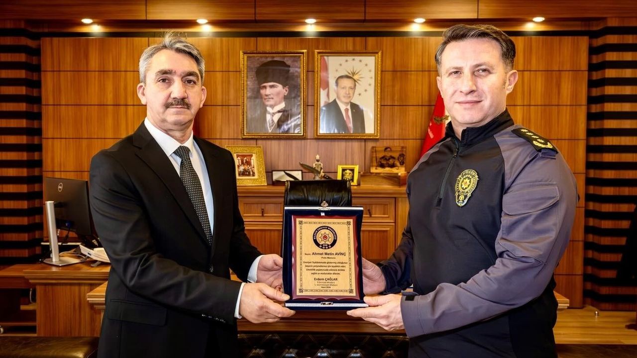 Bilecik İl Emniyet Müdürü Erdem Çağlar, Özel Kalem Büro Amirliğinde görev yaparken yaş haddinden emekliye ayrılan Polis Memuru Ahmet Metin Avinç'e teşkilata yıllar boyunca sunduğu hizmetlerden dolayı plaket verdi. Emniyet teşkilatında uzun yıllar görev yapan Avinç'in özverili çalışmaları ve hizmetleri dolayısıyla düzenlenen plaket takdiminde, meslek hayatı boyunca devletine ve milletine bağlılıkla görev yapan polis memuruna teşekkür edildi.