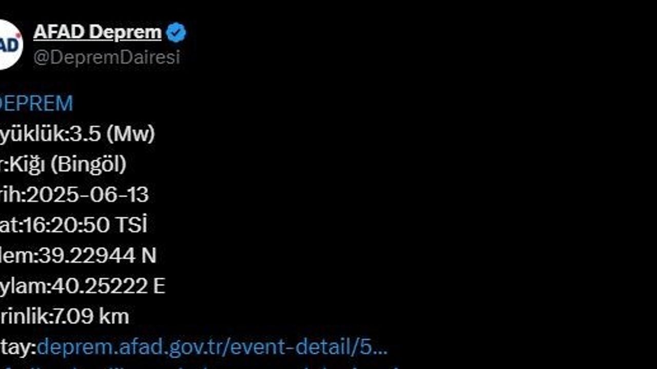 AFAD’dan yapılan açıklamaya göre, saat 16.20’de merkez üssü Bingöl’ün Kiğı ilçesinde 3.5 büyüklüğünde deprem meydana geldi. Yerin 7.09 kilometre derinliğinde meydana gelen depremde şimdiye kadar olumsuz bir duruma rastlanmadığı kaydedildi.