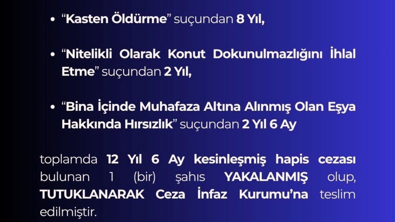 Bingöl İl Emniyet Müdürlüğü Asayiş Şube Müdürlüğü arana şahısların yakalanması için çalışmalarını sürdürüyor. Ekipler bu kapsamda 'Kasten öldürme' suçundan 8 yıl, 'Nitelikli olarak konut dokunulmazlığını ihlal etme' suçundan 2 yıl, 'Bina içinde muhafaza altına alınmış olan eşya hakkında hırsızlık' suçundan ise 2 yıl 6 ay olmak üzere toplam 12 yıl 6 ay kesinleşmiş hapis cezası bulunan şahsı yakaladı. Şahıs emniyetteki işlemlerinin ardından sevk edildiği adli makamlarca tutuklanarak ceza infaz kurumuna teslim edildi.