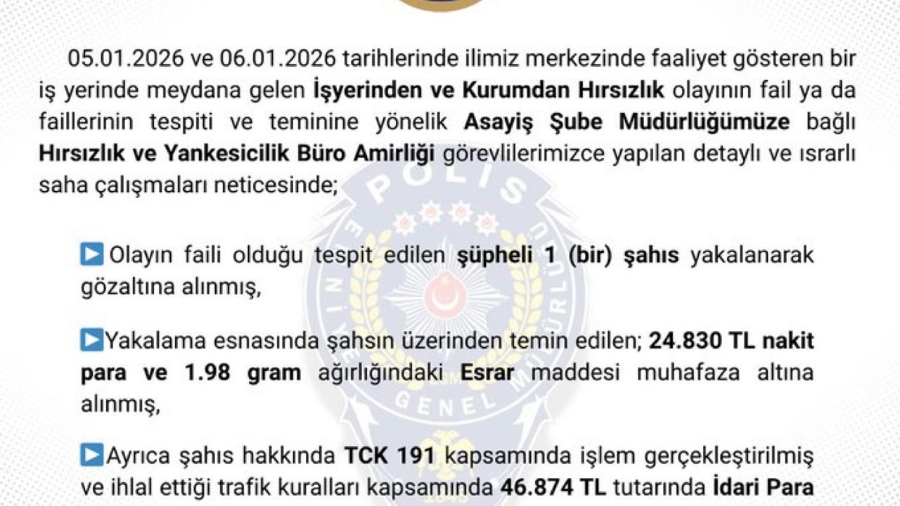 Bingöl Emniyet Müdürlüğü'nden yapılan açıklamada, '05.01.2026 ve 06.01.2026 tarihlerinde ilimiz merkezinde faaliyet gösteren bir iş yerinde meydana gelen İşyerinden ve Kurumdan Hırsızlık olayının fail ya da faillerinin tespiti ve teminine yönelik Asayiş Şube Müdürlüğümüze bağlı Hırsızlık ve Yankesicilik Büro Amirliği görevlilerimizce yapılan detaylı ve ısrarlı saha çalışmaları neticesinde; Olayın faili olduğu tespit edilen şüpheli 1 (bir) şahıs yakalanarak gözaltına alınmış, Yakalama esnasında şahsın üzerinden temin edilen; 24.830 TL nakit para ve 1.98 gram ağırlığındaki Esrar maddesi muhafaza altına alınmış, ayrıca şahıs hakkında TCK 191 kapsamında işlem gerçekleştirilmiş ve ihlal ettiği trafik kuralları kapsamında 46.874 TL tutarında İdari para cezası uygulanmıştır. Farklı konularda çokça suç kaydı bulunan şüpheli şahıs adli mercilere intikal ettirilmiş olup, çıkarıldığı mahkemece tutuklanmıştır' denildi.