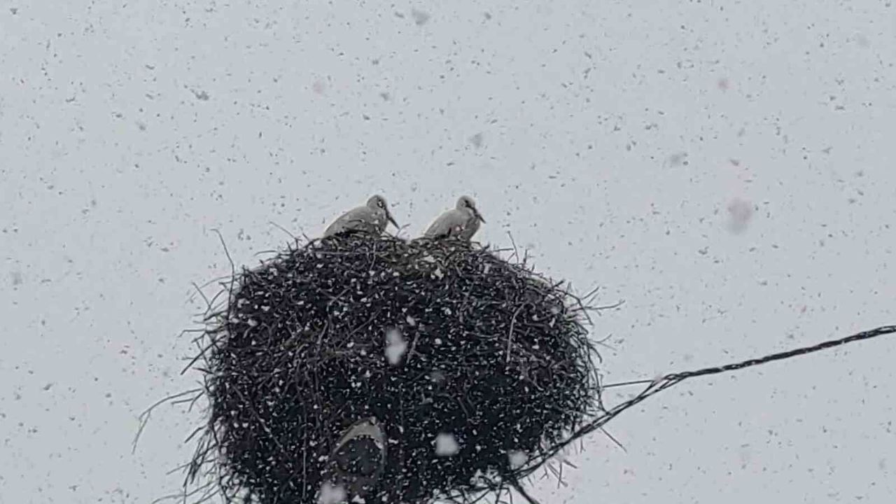 Baharın habercisi olarak bilinen leylekler, Bingöl'e erken gelince kar yağışına yakalandı.