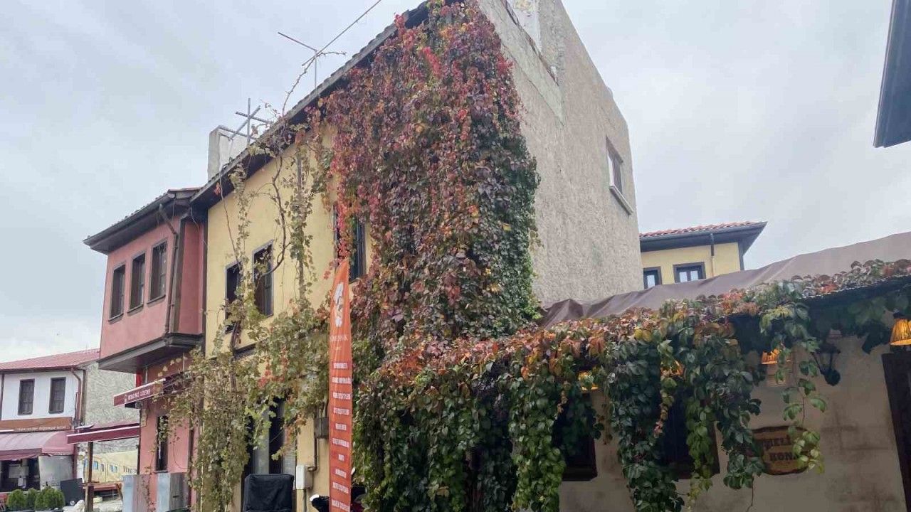 Eskişehir’de sonbaharın tonlarına bürünen bitkiler ile kaplanan tarihi yapı, kartpostallık manzarası ile bulunduğu sokağın çehresini değiştiriyor.