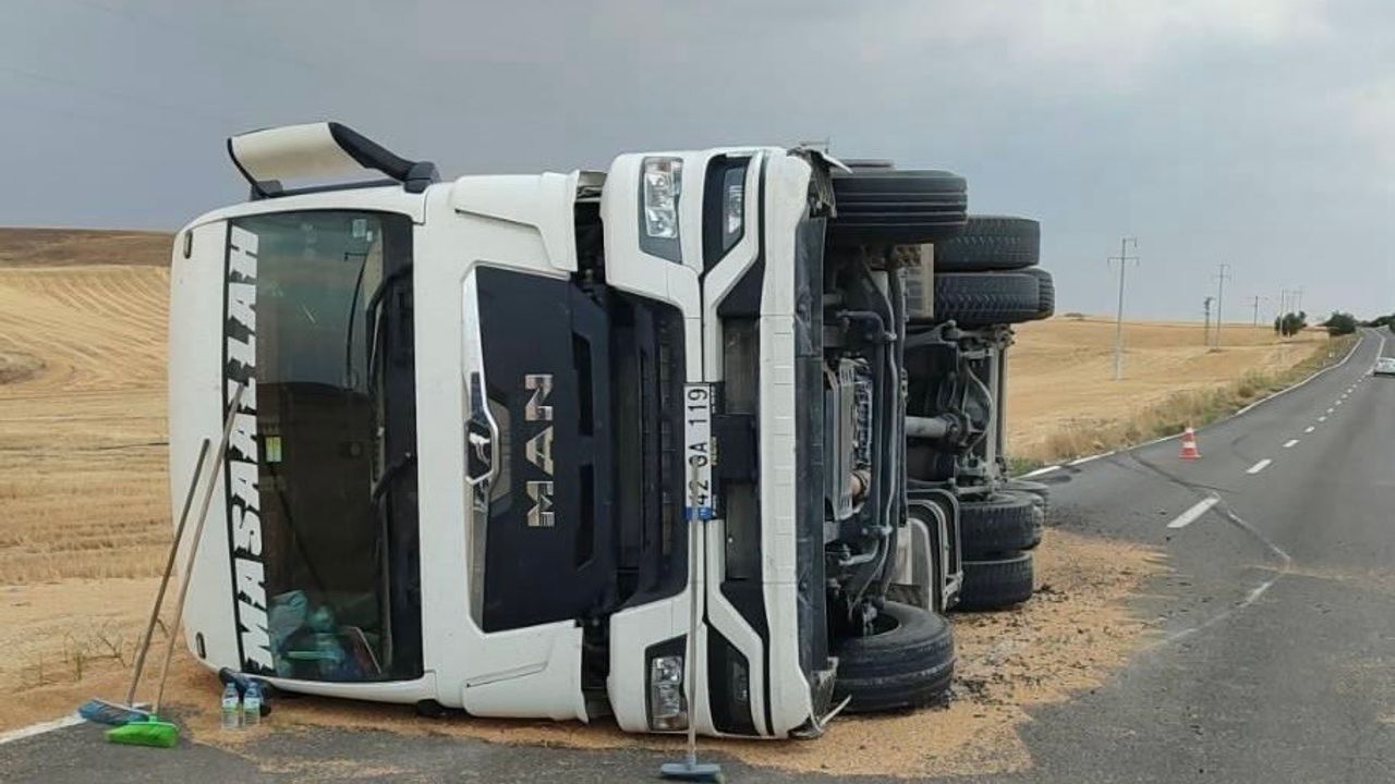 Konya’nın Kulu ilçesinde buğday yüklü kamyonun devrilmesi sonucu sürücü yaralandı.