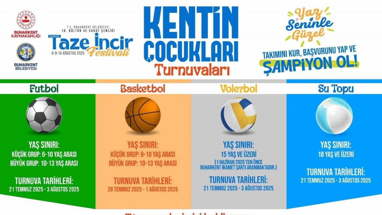 Buharkent Kaymakamlığı ve Buharkent Belediyesi iş birliğiyle düzenlenen turnuvalar ile gençlerin festival coşkusuna sporla ortak olması hedeflenirken, yaş gruplarına ve branşlara göre farklı tarihlerde yapılacak müsabakalara başvurular başladı. Futbol Turnuvası, 21 Temmuz - 3 Ağustos 2025 tarihleri arasında yapılacak. Turnuva, küçük grup (6-10 yaş) ve büyük grup (10-13 yaş) olmak üzere iki kategoride düzenlenecek. Basketbol Turnuvası ise 28 Temmuz - 1 Ağustos 2025 tarihleri arasında yine aynı yaş kategorilerinde yapılacak. Voleybol Turnuvası 21 Temmuz - 3 Ağustos 2025 tarihleri arasında gerçekleştirilecek ve katılımcıların 1 Haziran 2025’ten önce Buharkent’te ikamet ediyor olması şartı aranacak. Su Topu Turnuvası da aynı tarihlerde yapılacak ve sadece 18 yaş ve üzeri bireylerin katılımına açık olacak. Turnuvaya katılmak isteyenlerin 18 Temmuz 2025 tarihine kadar Buharkent Belediyesi Kültür ve Sosyal İşler Müdürlüğü’ne başvuru yapmaları gerektiği belirtildi.