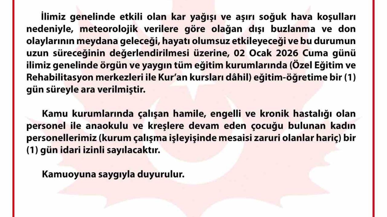 Bursa Valiliğinden yapılan açıklamada, 'İlimiz genelinde etkili olan kar yağışı ve aşırı soğuk hava şartları sebebiyle, meteorolojik verilere göre olağan dışı buzlanma ve don olaylarının meydana geleceği, hayatı olumsuz etkileyeceği ve bu durumun uzun süreceğinin değerlendirilmesi üzerine, 2 Ocak 2026 Cuma günü ilimiz genelinde örgün ve yaygın tüm eğitim kurumlarında (Özel Eğitim ve Rehabilitasyon merkezleri ile Kur'an kursları dahil) eğitim-öğretime 1 gün süreyle ara verilmiştir. Kamu kurumlarında çalışan hamile, engelli ve kronik hastalığı olan personel ile anaokulu ve kreşlere devam eden çocuğu bulunan kadın personellerimiz (kurum çalışma işleyişinde mesaisi zaruri olanlar hariç) 1 gün idari izinli sayılacaktır' denildi.