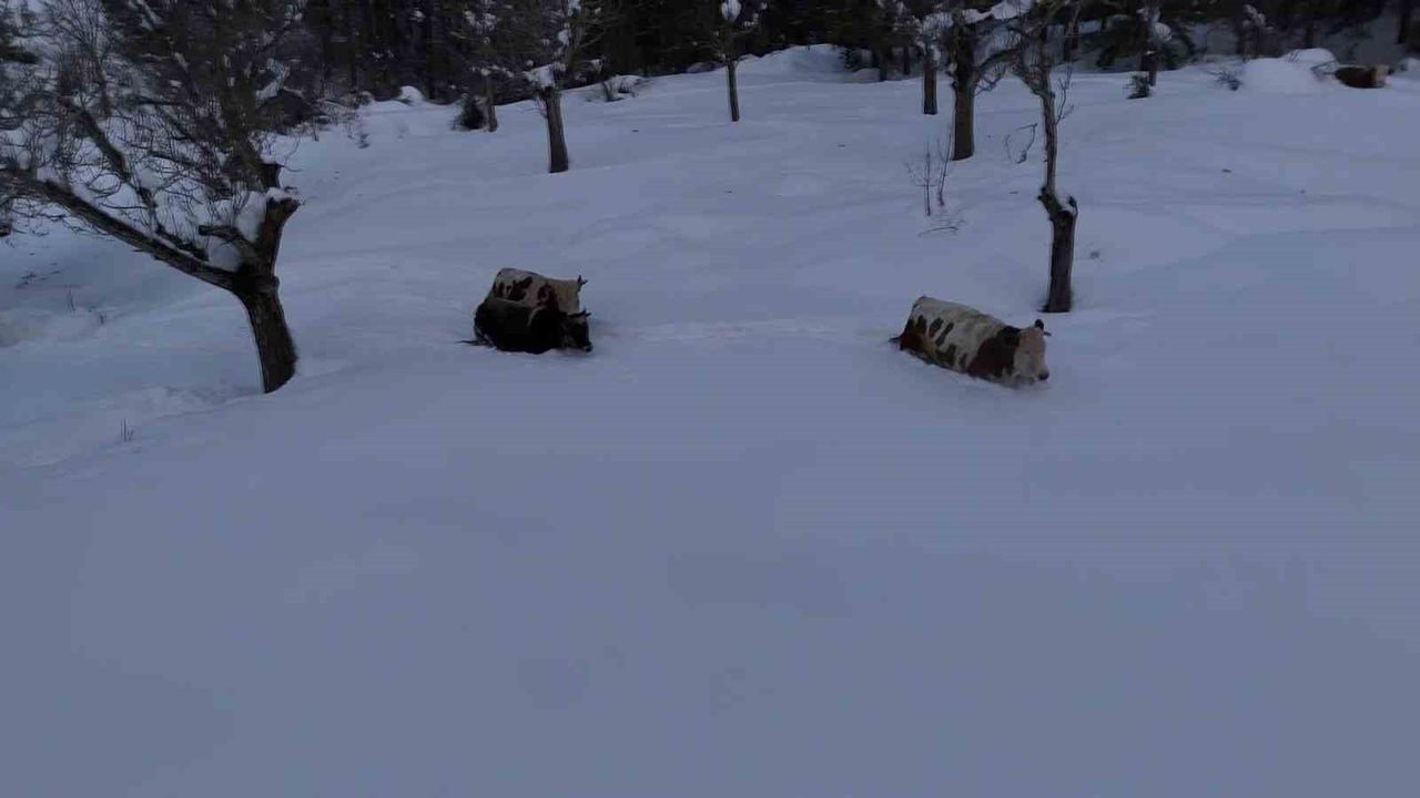 Dron görüntülerinde, beyaz örtüyle kaplanan bölgede büyükbaş hayvanların güçlükle yürüdüğü ve karın etkisinin bölgede yaşamı zorlaştırdığı gözlemlendi.