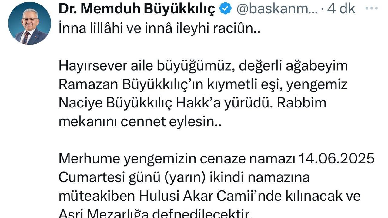 Başkan Büyükkılıç, yengesinin vefatı ile ilgili yaptığı sosyal medya paylaşımında, "İnna lillâhi ve innâ ileyhi raciûn. Hayırsever aile büyüğümüz, değerli ağabeyim Ramazan Büyükkılıç’ın kıymetli eşi, yengemiz Naciye Büyükkılıç Hakk’a yürüdü. Rabbim mekanını cennet eylesin. Merhume yengemizin cenaze namazı 14.06.2025 Cumartesi günü ikindi namazına müteakiben Hulusi Akar Camii’nde kılınacak ve Asri Mezarlığa defnedilecektir" ifadelerine yer verdi.
