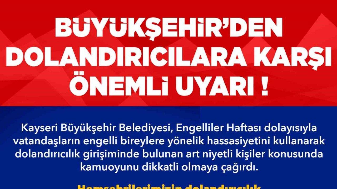 Kayseri Büyükşehir Belediyesi, Engelliler Haftası dolayısıyla vatandaşların engelli bireylere yönelik hassasiyetini kullanarak dolandırıcılık girişiminde bulunan art niyetli kişiler konusunda kamuoyunu dikkatli olmaya çağırdı.