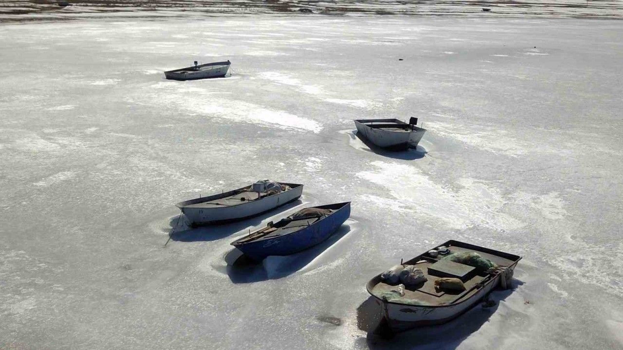 Bitlis’in Ahlat ilçesinde soğuklar nedeniyle yüzeyi tamamen donan Nazik Gölü’ndeki balıkçı tekneleri buzların içinde kartpostallık görüntü oluşturuyor.