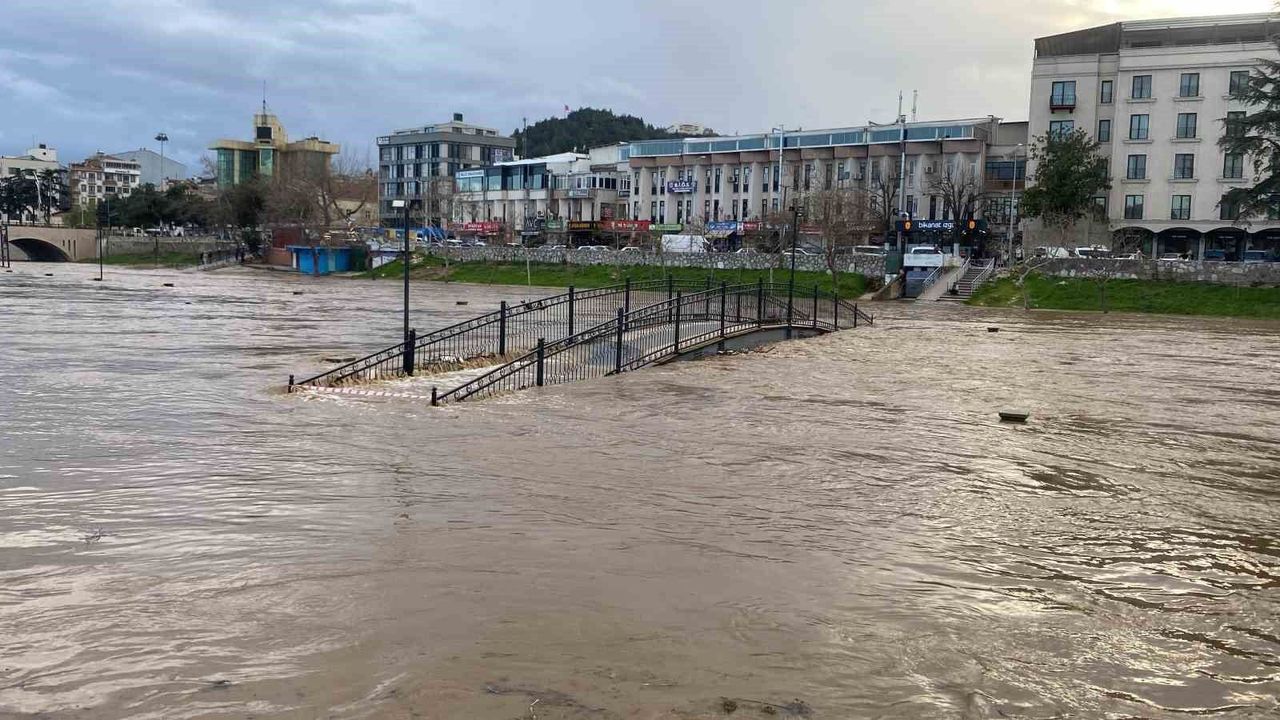 Çanakkale'nin Biga ilçesinde etkili olan yağmur nedeniyle ilçe merkezinden geçen Kocabaş Çayı taştı. Otopark olarak kullanılan alan sular altına kaldı.